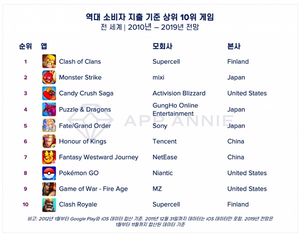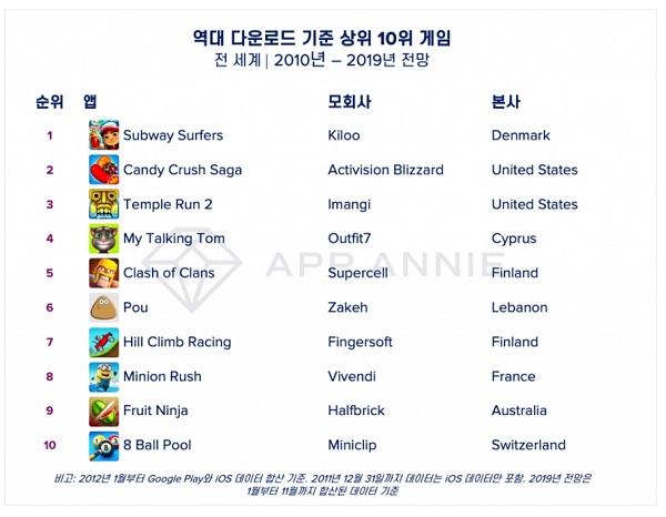 26일 모바일 데이터 및 분석 플랫폼인 앱애니는 2010년대를 마무리하며 지난 10년간 전 세계 모바일 게임 누적 다운로드 수 및 소비자 지출 상위 10위를 선정해 발표했다.
