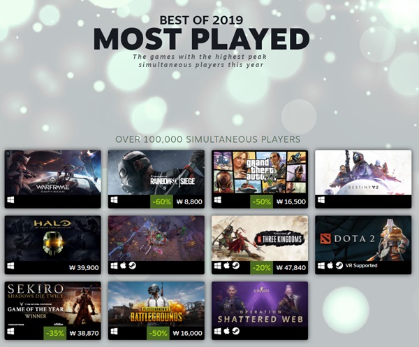 올해 10만명 이상의 동시접속자 수를 기록한 게임(Most Played) 부문에는 ▲디지털익스트림즈의 ‘워프레임’ ▲유비소프트의 ‘레인보우식스 시즈’ ▲락스타게임즈의 ‘GTA5’ ▲번지의 ‘데스티니2’ ▲ MS의 ‘헤일로: 더 마스터 치프 콜렉션’ ▲밸브의 ‘도타 언더로드’ ▲세가의 ‘토탈워: 삼국’ ▲밸브의 ‘도타2’ ▲액티비전의 ‘세키로’ ▲펍지주식회사의 ‘플레이어언노운스 배틀그라운드’ ▲밸브의 ‘CS: GO’ 등 11개 게임이 선정됐다.
