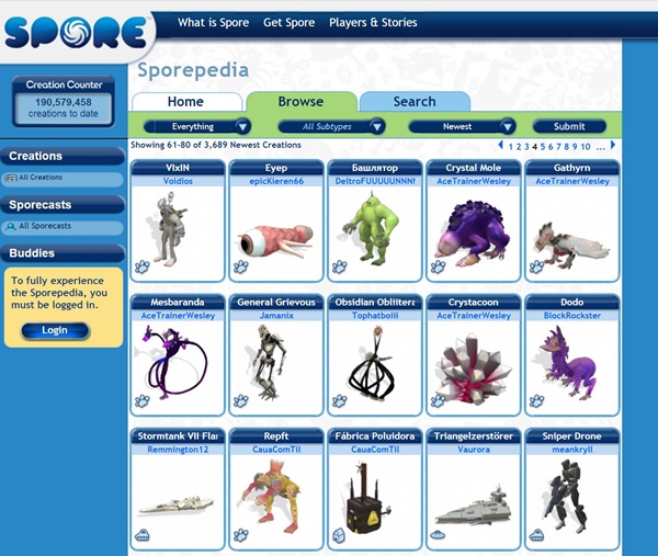 무엇보다도 사람들을 열광시킨 것은 다양한 생명체를 직접 창조해 낼 수 있다는 설정이었는데 지금도 Sporepedia(스포피디아)에 가면 온갖 기상천외한 상상력으로 탄생시킨 크리처라 불리는 생명체들을 감상할 수 있다. 현재 스포피디아 사이트에 가면 총 1억 9057만개(거의 2억)가 넘는 크리처들을 볼 수 있다.