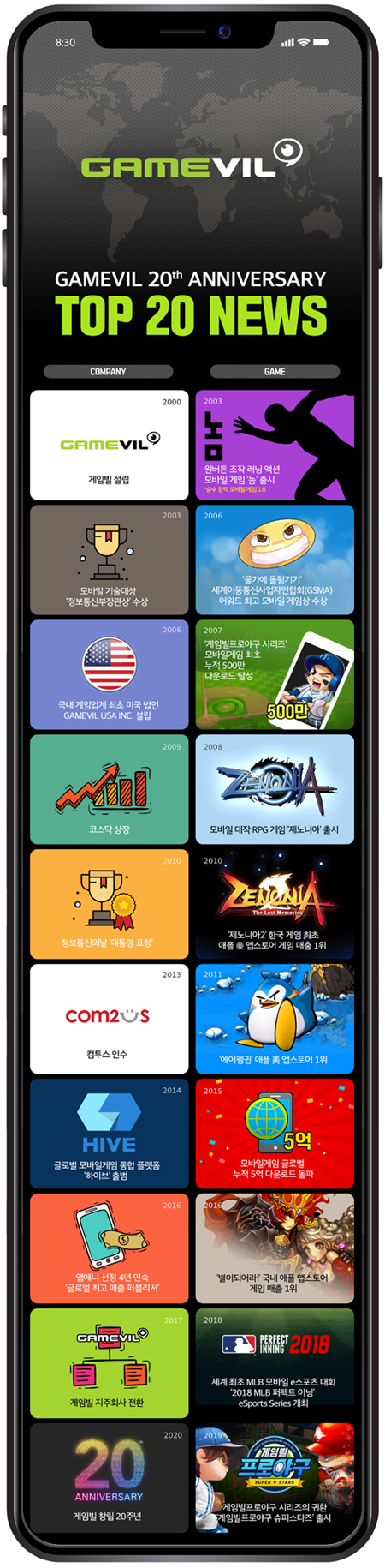 게임빌(대표 송병준)이 창립 20주년을 맞아 ‘TOP 20 NEWS’ 인포그래픽을 13일 공개했다.