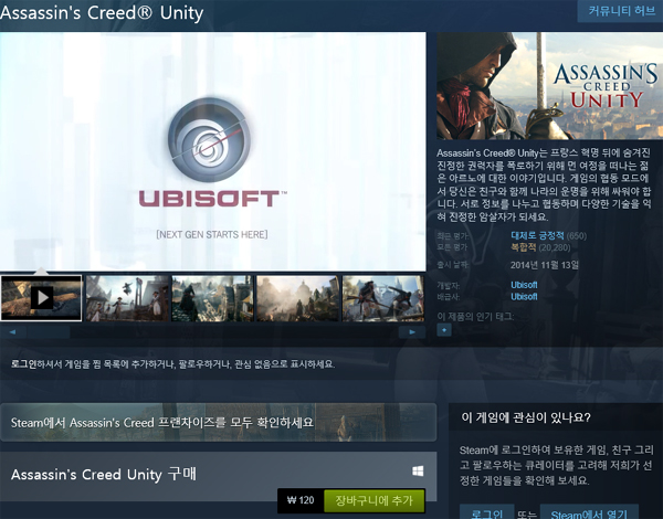 유비소프트의 게임 ‘어쌔신크리드: 유니티’가 스팀에서 한국 돈 120원에 판매돼 눈길을 끈다. 유저들은 “껌값보다 싸다”며 신기하다는 반응이다.