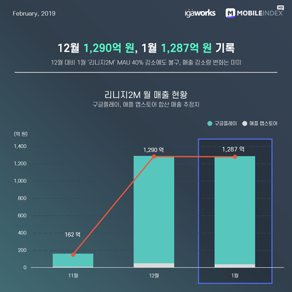 구글플레이와 애플 앱스토어의 합산 월별 매출 추정치를 분석한 결과, 2019년 11월(162억원), 2019년 12월(1290억원), 2020년 1월(1287억원)으로 집계됐다. ‘리니지2M’ MAU는 안드로이드OS 기준, 2019년 11월(77만5524), 2019년 12월(74만1148), 2020년 1월(44만5932)이다.