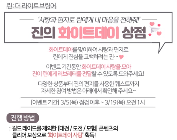 ‘액스(AxE)'에서는 3월 25일까지 이벤트 업적을 달성하여 '막대사탕'을 제작할 수 있으며, 이를 통해 루비를 획득할 수 있다. 또한, 화이트데이 특별 상점을 열어 '펫 승급석 30개 선택권' 1개, '1등급 사료' 3개, '영양 만점 사료' 4개를 판매한다.