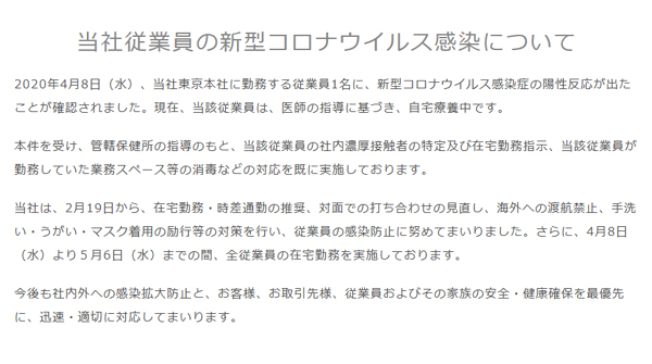 이어 “담당 보건소의 지도에 따라 해당 사내 접촉자의 특정 및 재택근무 지시, 해당 직원이 근무했던 업무 공간의 소독을 실시했다”고 덧붙였다.