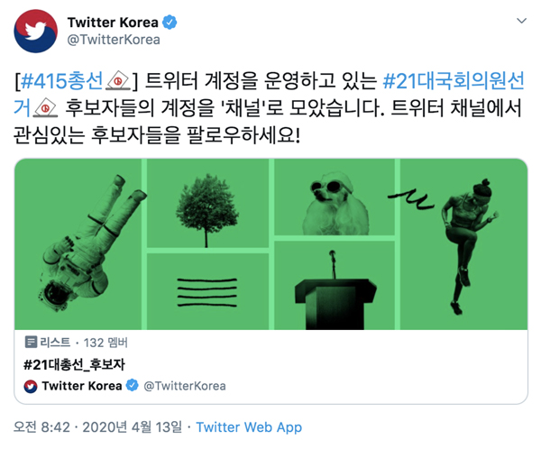 이틀 앞으로 다가온 선거를 앞두고 트위터 코리아는 공식 계정을 통해 총 10개 정당 132명 후보들의 트위터 공식 계정을 정리해 공개했다. 후보자들의 트위터 계정을 팔로우하면 중점 공약 및 유세 일정 등 최신 소식을 업데이트 받을 수 있고, 트위터 멘션이나 다이렉트 메시지(DM)를 보내 궁금한 점을 질문할 수도 있다.