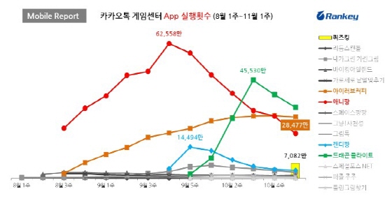 6000만명의 회원을 확보한 국민메신저 카카오톡은 지난 7월 30일 안드로이드 시장을 공략하여 10개의 게임을 갖고 ‘게임하기’를 오픈했다. 특히 마력의 1분 게임 ‘애니팡’은 8월 3주에만 신규설치자 수 274만 명을 기록하며 보름 만에 국민게임으로 떠올랐다.