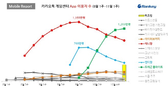 그런데 이 같은 ‘잭팟’ 유통기한이 점차적으로 짧아지고 있다는 분석 자료가 나와 눈길을 끌고 있다. 최근 랭키닷컴은 11월 12일 기준 랭키닷컴에 등록된 ‘for Kakao’로 표기된 총 25개의 앱을 분석한 자료를 내놨다.