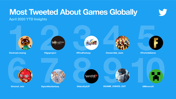 1월부터 4월 22일까지 트위터에서 가장 많이 언급된 게임 순위도 함께 공개됐다. 1위는 출시와 동시에 선풍적인 인기를 끌고 있는 닌텐도의 ‘동물의 숲’이 올랐다. ‘동물의 숲’은 지난달 출시 이후 260만 건의 언급량을 기록했다. 이는 2위에 오른 ‘페이트/그랜드 오더’의 언급량보다 2배 이상 많은 수치다.