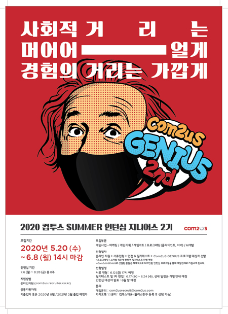 컴투스(대표 송병준)는 글로벌 게임 분야에서 활약할 인재를 발굴하고 육성하기 위해 마련된 인턴십 프로그램 ‘컴투스 Summer 인턴십 지니어스’의 참가자 모집을 실시한다고 밝혔다.