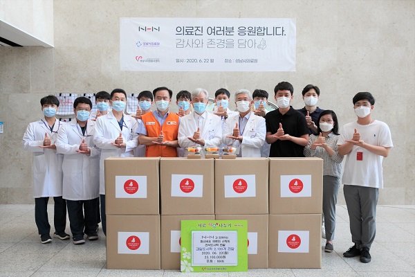 ‘덕분에 챌린지’는 중앙재난안전대책본부가 '코로나19' 치료와 확산방지를 위해 노력 중인 의료진에게 감사와 응원의 메시지를 전하기 위해 시작한 국민참여형 캠페인이다. NHN과 성남시자원봉사센터(이덕은 센터장)는 6월 22일 성남시의료원(이중의 원장)에서 사랑의 과일도시락 2100개(2300만원 상당)를 의료진분들께 기증하는 전달식을 진행했다.