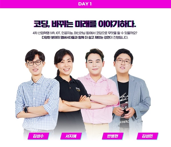 15일에는 NXC의 트레이딩 플랫폼 개발 자회사 아퀴스의 김성민 대표와 VR 콘텐츠 제작사 비브스튜디오스의 김성수 연구소장, 클라우드 서비스 기업 아마존웹서비스(Amazon Web Services, AWS)의 인공지능 머신러닝 전문가 서지혜 스페셜리스트, AI, IoT를 활용한 스마트팜 스타트업 상상텃밭의 반병현 이사 등이 자신의 코딩 경험과 코딩의 미래를 이야기한다.