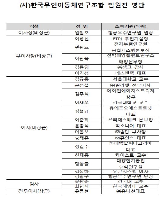 이날 감사 2명(윤광준 건국대 교수-최형식 한국해양대 교수), 부이사장 5명(이병선 ETRI 무인기실장, 원광호 전자부품연구원 융합시스템본부장, 이판묵 선박해양플랜트연구소 해양본부장, 김룡영 ㈜샘코 감사, 이기성 네스앤텍 대표)와 이사 17명(상근이사 유동현 ㈜유니현 대표, 이사장사 1명(강왕구 항공우주연구원 단장) 포함)의 임원진을 선출했다.