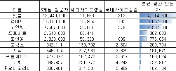 업비트는 366만 7000명으로 2위를 기록했다. 3위는 250만 2000명의 평균 방문자를 기록한 코인빗이 4위, 5위는 88만 2838명-77만 6054명이 방문한 프로비트, 코인원순으로 나타났다.