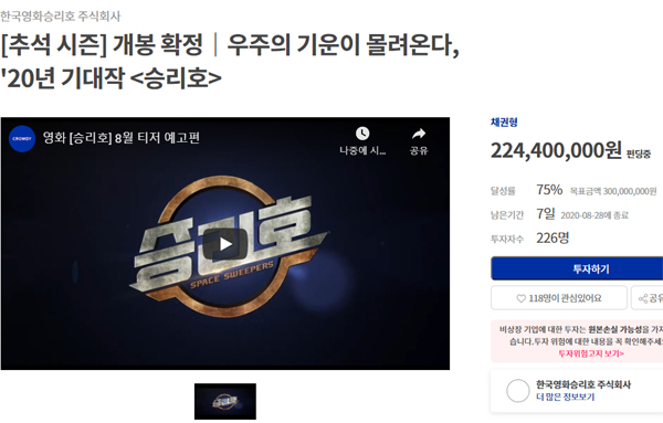 ‘승리호’는 이미 9월 추석 연휴 개봉일을 확정 지은 상태다. 그런데 현재 코로나19 확산으로 개봉작의 시사회와 무대인사가 연이어 취소되고, 개봉이 연기되는 등 여파가 커지고 있다. 만약 사회적 거리두기가 3단계로 격상되면 극장은 영업을 중단해야 한다. 이 경우 ‘승리호’ 역시 개봉 자체가 무산되거나 연기될 가능성도 있다. 청약기간을 연장했으나 투자자들이 얼마나 더 모일지 장담할 수 없는 상황이 돼 버렸다.
