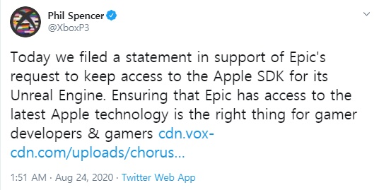 필 스펜서(Phil Spencer) 마이크로소프트 게임 총책임자는 24일 트위터를 통해 “오늘 우리는 언리얼엔진이 애플 SDK에 계속 접근하게 해달라는 에픽게임즈의 요청을 지지하는 성명서를 (법원에) 제출했다”며 “에픽게임즈가 최신 애플 기술에 접근할 수 있는 일은 게이머 및 개발자들에게 올바른 일”이라고 전했다.
