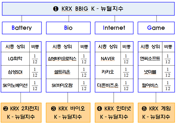 거래소는 “최근 미래 성장주도 산업으로 각광받고 있는 BBIG(배터리·바이오·인터넷·게임) 산업을 뉴딜분야로 선정해 K-뉴딜지수를 개발했다”고 밝혔다. 앞서 정부는 지난 7월 14일 신종 코로나 바이러스 감염증(코로나19) 위기 극복과 코로나 이후 글로벌 경제 선도를 위한 국가발전 전략으로 한국판 뉴딜 종합계획을 발표한 바 있다.