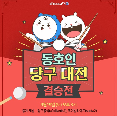 아프리카TV는 9월 19일(토) 오후 3시 ‘동호인 당구 대전’ 결승전을 생중계 한다고 밝혔다. ‘동호인 당구 대전’은 UM, 빌포텐, 유니티, 벤투스 등 총 16개팀의 당구 동호회들이 참여해 지난 5월 12일(화)를 시작으로, 약 4개월 간 토너먼트 형식으로 진행됐다.