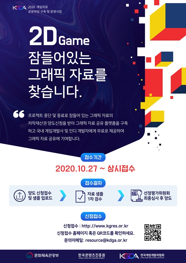 ‘2020 게임자료 공유마당 구축 및 운영사업’은 국내 게임사의 유휴 자료를 확보하 여 2D 그래픽, 3D 그래픽, 사운드, BGM 자료 등 게임 개발에 필요한 다양한 자 료를 국내 게임사 및 개발자, 공공 교육기관들에게 무료 배포를 목표로 하며, 1차 년도인 올해에는 2D 그래픽 자료를 우선적으로 확보할 예정이다. 양도 신청 접수 대상은 국내의 대형 게임사, 중소 게임사 및 1인 개발자 등 개인 사업자도 가능하 다. 프로젝트 중단이나 서비스 종료로 잠들어 있는 자료를 보유한 게임사 및 개인 은 게임자료 저작권 양도 신청 사이트에서 신청서 작성과 샘플 자료 업로드를 통해 접수가 가능하다.