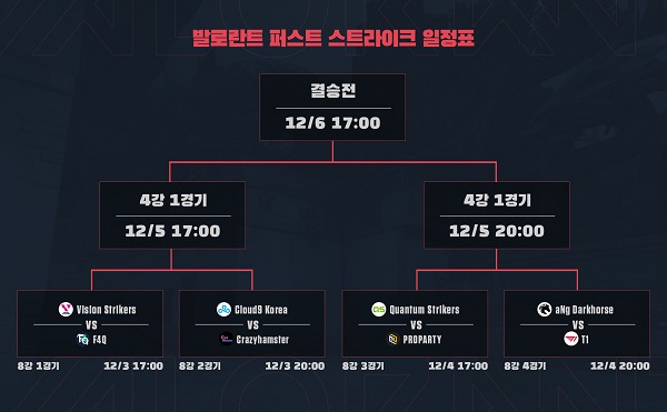 이번 퍼스트 스트라이크 본선은 8강 싱글 엘리미네이션 토너먼트로, 12월 3일과 4일 양일에 걸쳐 8강 경기가 펼쳐지며, 5일 준결승전은 Bo3로, 6일 결승전은 Bo5로 진행된다.