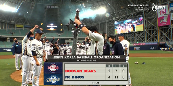 NC 다이노스는 24일 오후 서울 고척스카이돔에서 열린 한국시리즈 6차전 경기에서 두산 베어스를 상대로 4-2로 승리, 시리즈 전적 4승 2패로 한국시리즈 우승을 차지했다.