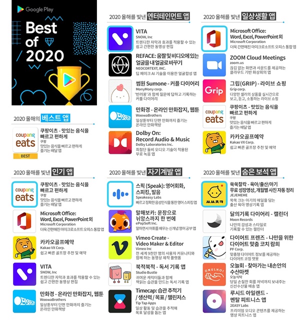 이외에 ‘2020 올해를 빛낸 앱’ 부문별 최우수상에는 ▲VITA(올해를 빛낸 엔터테인먼트 앱) ▲마이크로소프트 오피스(올해를 빛낸 일상생활 앱) ▲스픽(Speak)(올해를 빛낸 자기계발 앱) ▲쑥쑥찰칵(올해를 빛낸 숨은 보석 앱)이 선정됐다.