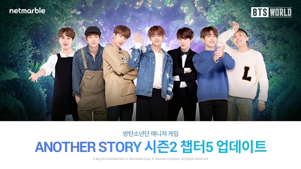 넷마블(대표 권영식, 이승원)은 방탄소년단 매니저 게임 ‘BTS 월드(BTS WORLD, 개발사 테이크원컴퍼니)에 ‘ANOTHER STORY(어나더 스토리) 시즌 2’의 새로운 챕터와 신규 5성 카드를 추가하는 업데이트를 실시했다고 3일 밝혔다.