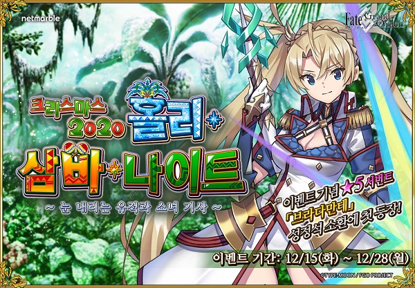 넷마블(대표 권영식, 이승원)은 모바일 RPG ‘페이트/그랜드 오더(Fate/Grand Order)’에서 신규 이벤트 ‘크리스마스 2020 홀리 삼바 나이트’를 오는 28일까지 개최한다고 밝혔다.