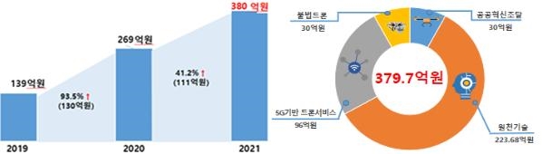 올해 착수한 무인이동체 원천기술개발사업(182억 원)과 DNA+ 드론기술개발(96억 원)'은 새해 투자를 확대한다.