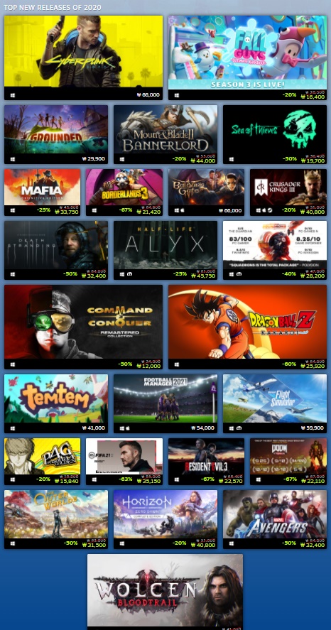 뉴 릴리즈 부문에서는 ‘사이버펑크2077’, ‘폴가이즈: 얼티밋 녹아웃’, ‘데쓰 스트랜딩’, ‘하프라이프: 알릭스’, ‘마이크로소프트 플라이트 시뮬레이터’, ‘둠 이터널’ 등이 선정됐다.