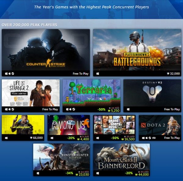 모스트 플레이 부문에서는 최고 동시접속자 수 20만명 이상을 기록한 11개 게임이 이름을 올렸다. ‘CS: GO’, ‘플레이어언노운스 배틀그라운드’, ‘라이프 이즈 스트레인지2’ ,’테라리아’, ‘데스티니2’ ,’사이버펑크2077’, 어몽어스’, ‘GTA5’, ‘도타2’, ‘몬스터헌터 월드’, ‘마운트 & 블레이드 배너로드’다. 스팀측은 올해 전반적인 동시접속자 수가 지난해보다 훨씬 높았다고 전했다.