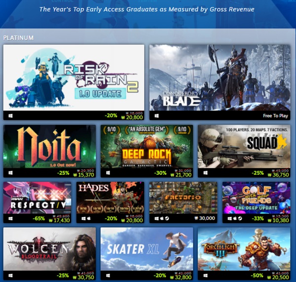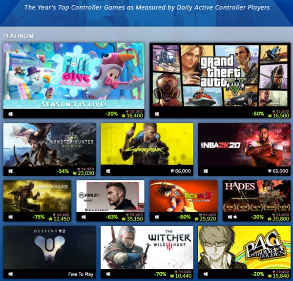톱 셀러 부문에서는 ‘GTA5’, ‘도타2’, ‘카운터 스트라이크 글로벌 오펜시브(CS: GO)’, ‘플레이어언노운스 배틀그라운드’ 등의 터줏대감들이 예년과 마찬가지로 플래티넘 등급에 자리잡았다. 이 외에도 ‘둠 이터널’, 데스티니2’, ‘폴가이즈: 얼티밋 녹아웃’, ‘어몽어스’, ‘사이버펑크2077’, 몬스터헌터 월드’, 레드 데드 리뎀션2’, ‘톰 클랜시의 레인보우식스 시즈’가 플래티넘 등급에 올랐다. 플래티넘 등급 중 올해 출시된 게임은 ‘둠 이터널’, ‘폴가이즈: 얼티밋 녹아웃’, ‘사이버펑크2077’ 등 단 세개 뿐이다. . 플래티넘 등급은 100개 게임 중 상위 12개 게임에 해당한다.