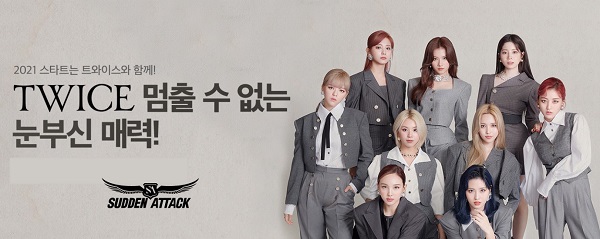 ‘서든어택’ 유저들은 트와이스 멤버 9인을 캐릭터로 모두 활성화하면 총 경험치 300%를 제공한다. 캐릭터는 새로운 감정 표현 3종과 함께 승리 포즈, 즉시 리스폰 효과 등 세트 효과를 갖는다.