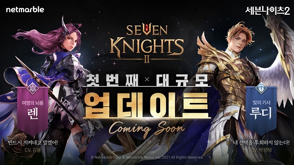 넷마블은 ‘세븐나이츠2’의 첫 대규모 업데이트를 1월 28일 진행할 계획이다. 이번 대규모 업데이트의 핵심은 신규 시나리오로, ‘세븐나이츠2’의 주인공인 렌과 루디가 시련을 겪으며 변화를 맞이할 예정이다. 변화한 렌과 루디는 각각 전설 영웅 '여명의 뇌룡 렌', '빛의 기사 루디'로 시나리오와 함께 업데이트된다.
