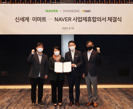 네이버㈜(대표이사 한성숙)는 16일 오전 JW메리어트 호텔에서 한성숙 네이버 대표, 최인혁 네이버파이낸셜 대표, 강희석 이마트 대표, 차정호 신세계백화점 대표 등 양사 주요 관계자가 참석한 가운데 온오프라인 커머스 시너지와 관련된 업무 협약식을 진행했다.