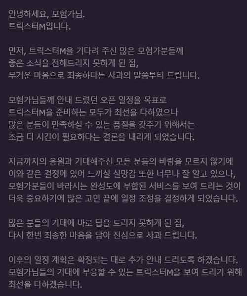 이어 “안내 드렸던 오픈 일정을 목표로 트릭스터M을 준비하는 모두가 최선을 다하였으나, 많은 분들이 만족하실 수 있는 품질을 갖추기 위해서는 조금 더 시간이 필요하다는 결론을 내리게 됐다”고 밝혔다.
