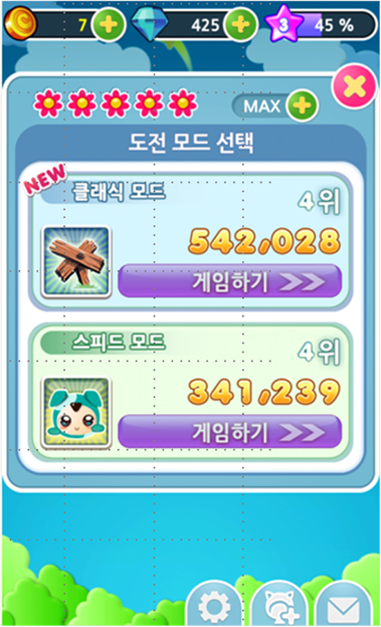 또한, ‘클래식모드’의 업데이트로, '뿌잉뿌잉 사천성'의 주간순위는 ‘스피드모드’와 ‘클래식모드’를 합산한 점수로 산정되며, 모드 선택에서 이미지를 클릭하면 각 모드 별 순위 및 점수가 확인 가능하다.