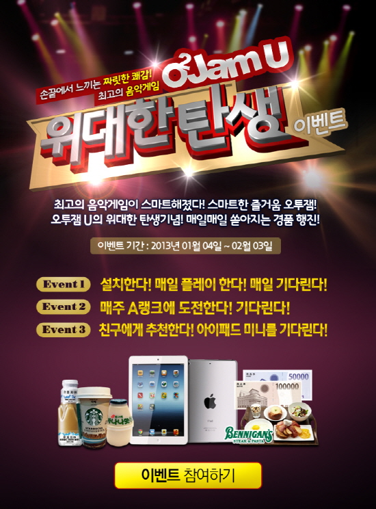함께 진행하는 이벤트는 “설치하고, 플레이하고, 기다려라”라는 타이틀로 진행되며, 타이틀대로 신규/기존 사용자 모두 플레이만 하면 자동으로 참여가 되며, 경품으로는 스타벅스커피, 베니건스 외식 상품권과 함께 추첨을 통해 아이패드 미니 3명, 슈어 이어폰 2명, 백화점 상품권 12명 등 푸짐한 상품을 증정한다.