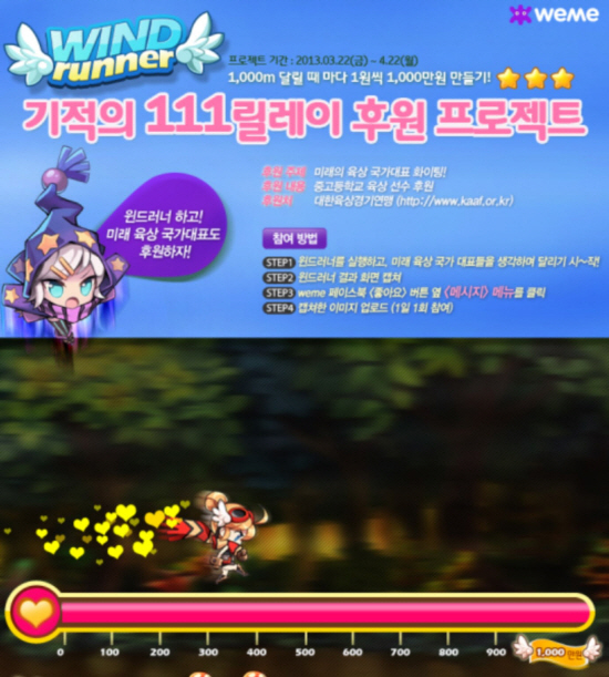 그 첫 스타트는 ‘기적의 111 릴레이 후원 프로젝트’다. 위메이드 모바일게임 브랜드인 weme 공식 페이스북(https://www.facebook.com/weme.wemade)을 통해 이벤트를 시작한다.