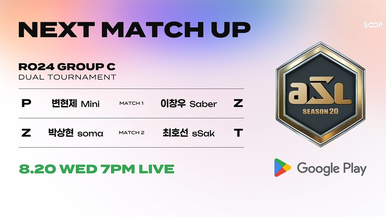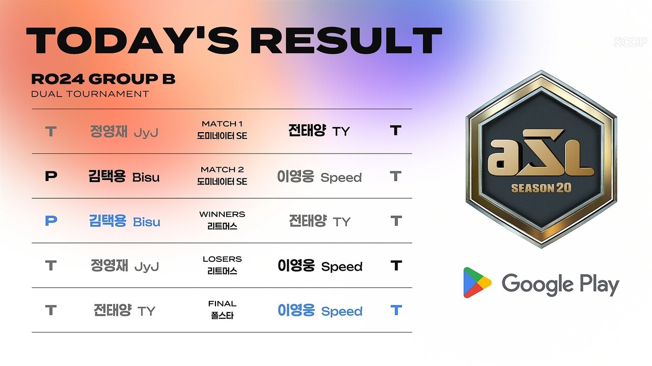 라이브 스트리밍 플랫폼 SOOP은 19일 스타크래프트 대회 'Google Play ASL 시즌 20' 24강 B조 경기를 진행했다. 24강 B조에는 김택용, 정영재, 전태양, 이영웅이 대진을 이뤘다. 김택용을 제외한 나머지 선수가 전부 테란인 것도 경기 시작 전부터 시선을 사로잡았다.
