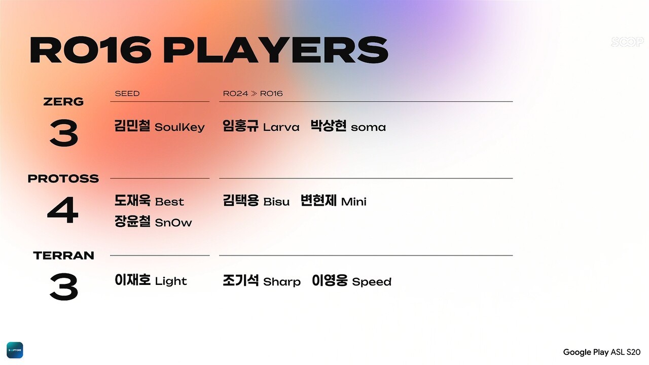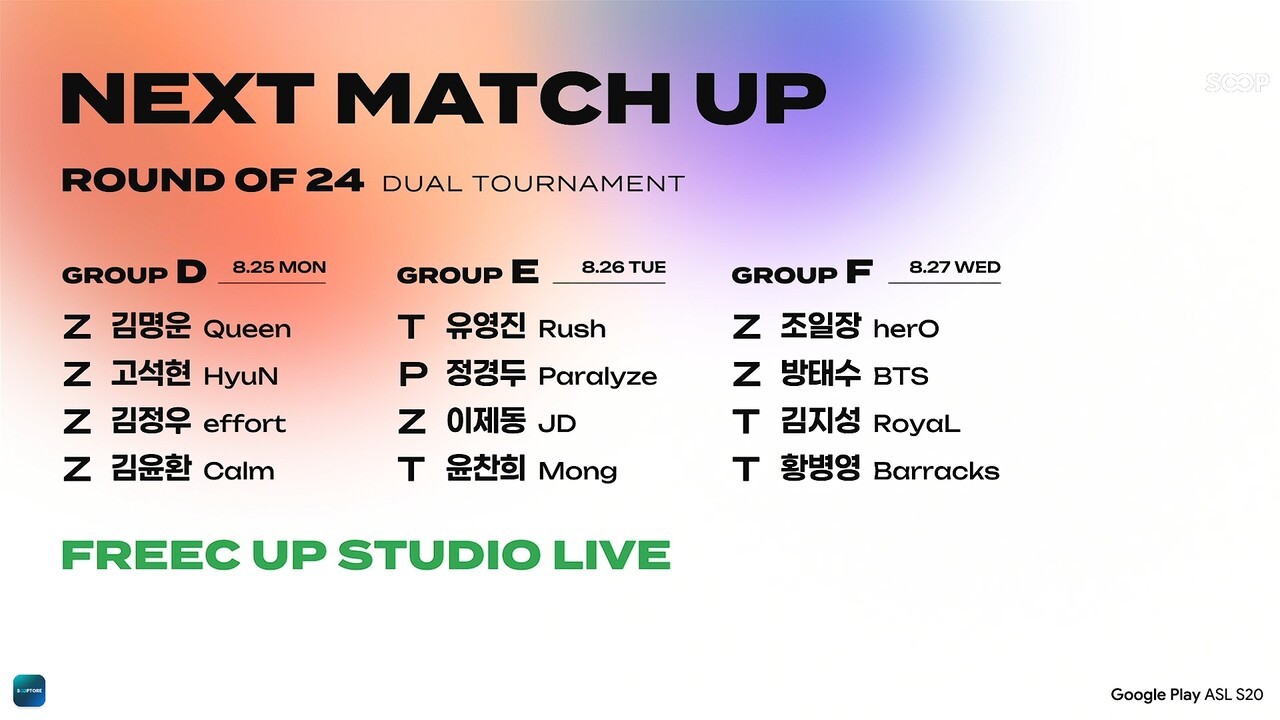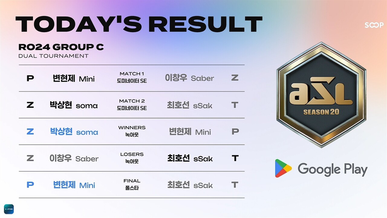 글로벌 라이브 스트리밍 플랫폼 SOOP은 20일 스타크래프트 대회 'Google Play ASL 시즌20' 24강 C조 경기를 진행했다. C조에는 변현제(P), 최호선(T), 이창우(Z), 박상현(Z)가 라인업을 이뤘다.