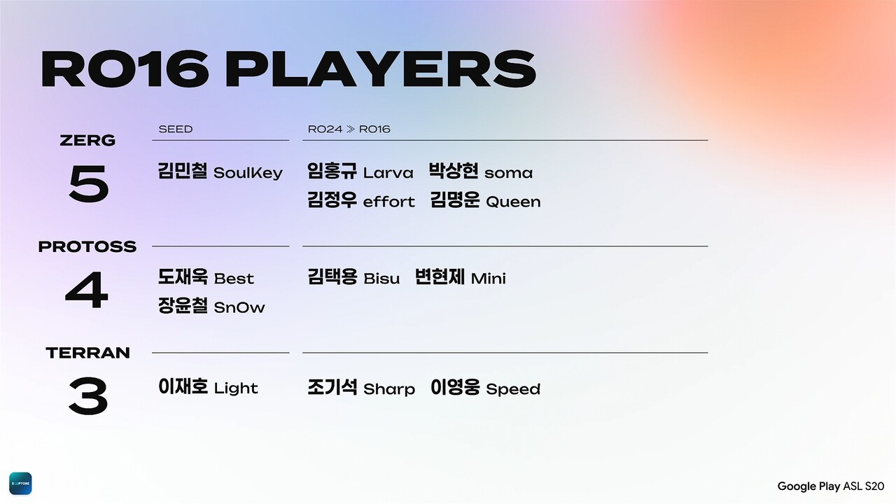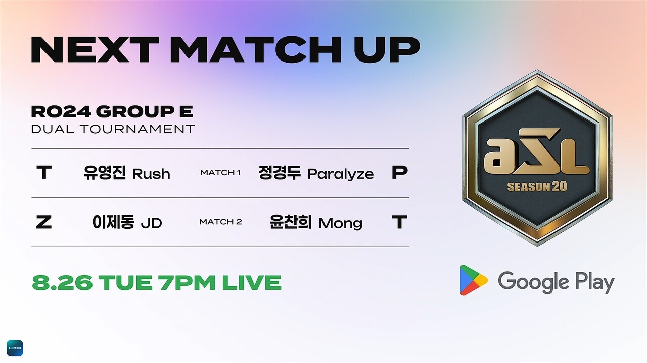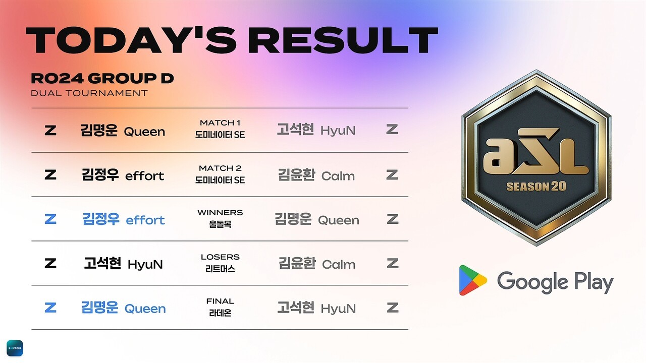 글로벌 라이브 스트리밍 플랫폼 SOOP은 25일 스타크래프트 대회 'Google Play ASL 시즌20' 24강 D조 경기를 진행했다. D조에서는 김명운, 김정우, 고석현, 김윤환이 대진을 이뤘다. 저그 선수들로만 이뤄진 매치인 만큼 그 어느 때보다 팬들의 관심도 집중됐다.
