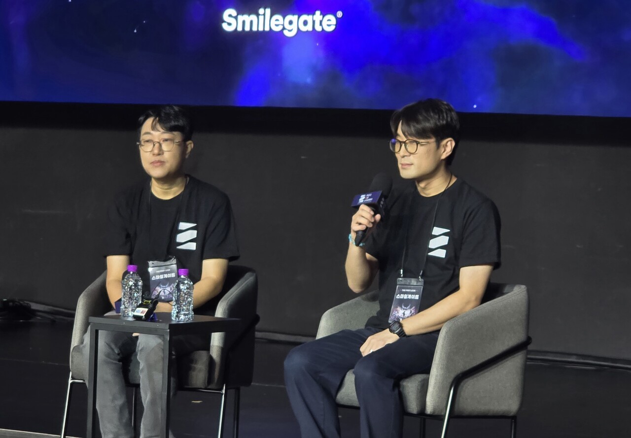 스마일게이트가 28일 '카오스 제로 나이트메어'의 시연 행사 '더 퍼스트 룩'을 서울 홍대 WDG 스튜디오에서 진행했다. 김형석 슈퍼크리에이티브 PD와 김주형 스마일게이트 사업실장이 참석해 카오스 제로 나이트메어를 소개하고 질의응답 시간을 가졌다.