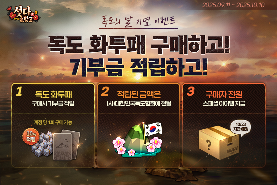 독도 기부 상품은 게임 머니 61억 쩐과 30일간 사용할 수 있는 독도 화투패 세트로 구성됐으며, 구매자에게는 10월 23일에 스페셜 아이템도 지급될 예정이다. 독도 기부 이벤트는 10월 10일까지 진행된다.