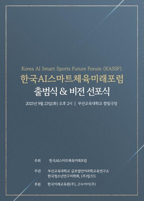 한국AI스마트체육미래포럼이 오는 9월 23일(화) 오후 2시, 부산교육대학교 참빛극장에서 비전 선포식을 열고 공식 출범한다.