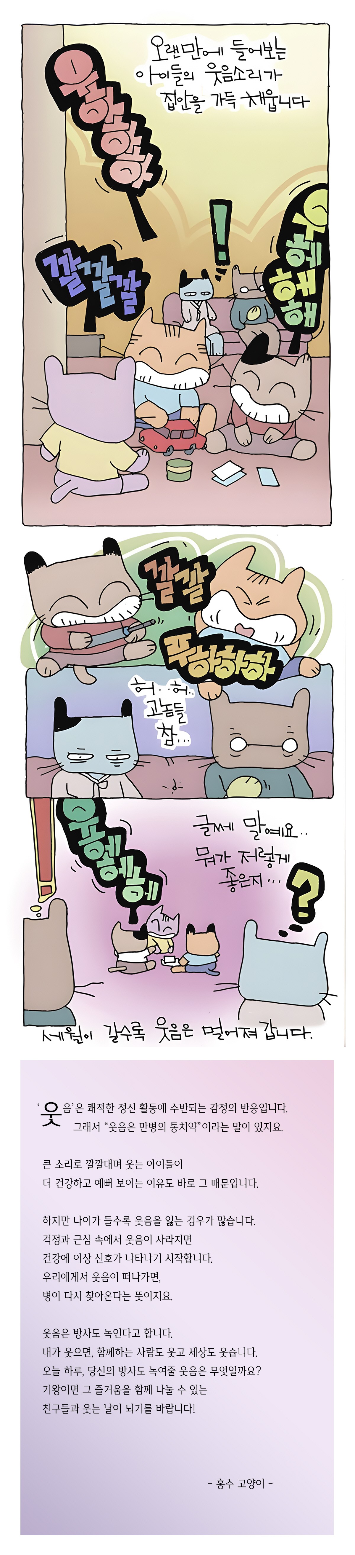 이 기사와 함께 보면 좋은 기사 주홍수의 웹툰 '나옹이네' 79화 '혼자서 살아남는 법' 주홍수의 웹툰 '나옹이네' 78화 '좋은 선배란’ 주홍수의 웹툰 '나옹이네' 77화 '폭탄, 불평불만이 많은 사람’ 주홍수의 웹툰 '나옹이네' 76화 '고자질쟁이’ 주홍수의 웹툰 '나옹이네' 75화 '칭찬합시다’ 제2회 노숙인돕기 ‘함께 맞는 비’ 혜화아트센터 전시 주홍수의 웹툰 '나옹이네' 74화 '위대한 사랑’ 주홍수의 웹툰 '나옹이네' 73화 '대인관계’