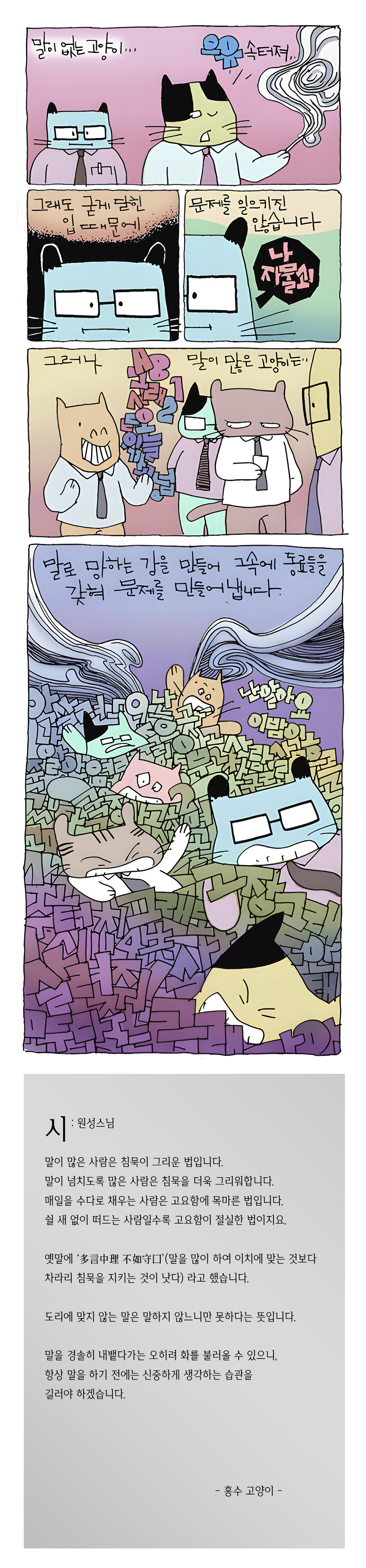 이 기사와 함께 보면 좋은 기사 주홍수의 웹툰 '나옹이네' 79화 '혼자서 살아남는 법' 주홍수의 웹툰 '나옹이네' 78화 '좋은 선배란’ 주홍수의 웹툰 '나옹이네' 77화 '폭탄, 불평불만이 많은 사람’ 주홍수의 웹툰 '나옹이네' 76화 '고자질쟁이’ 주홍수의 웹툰 '나옹이네' 75화 '칭찬합시다’ 제2회 노숙인돕기 ‘함께 맞는 비’ 혜화아트센터 전시 주홍수의 웹툰 '나옹이네' 74화 '위대한 사랑’ 주홍수의 웹툰 '나옹이네' 73화 '대인관계’