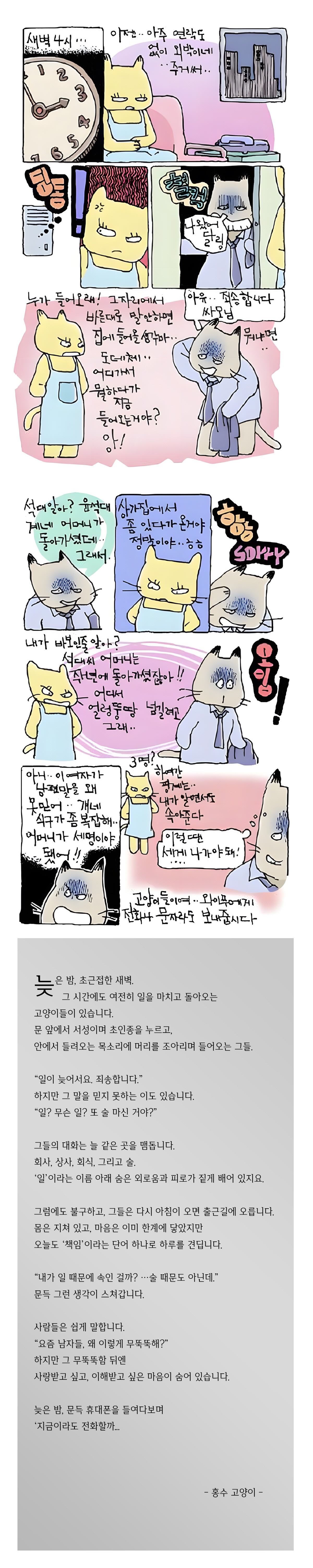 이 기사와 함께 보면 좋은 기사 주홍수의 웹툰 '나옹이네' 86화 '간장' 주홍수의 웹툰 '나옹이네' 85화 '여유가 있는 고양이' 주홍수의 웹툰 '나옹이네' 84화 '사랑한다는 것' 주홍수의 웹툰 '나옹이네' 83화 '말' 주홍수의 웹툰 '나옹이네' 82화 '웃음' 주홍수의 웹툰 '나옹이네' 81화 '사랑' 주홍수의 웹툰 '나옹이네' 80화 '마인드 바이러스' 주홍수의 웹툰 '나옹이네' 79화 '혼자서 살아남는 법'