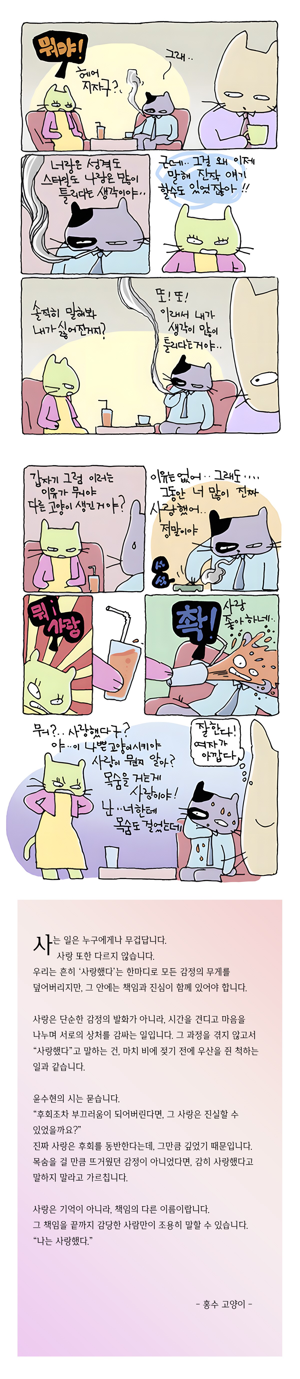 이 기사와 함께 보면 좋은 기사 주홍수의 웹툰 '나옹이네' 86화 '간장' 주홍수의 웹툰 '나옹이네' 85화 '여유가 있는 고양이' 주홍수의 웹툰 '나옹이네' 84화 '사랑한다는 것' 주홍수의 웹툰 '나옹이네' 83화 '말' 주홍수의 웹툰 '나옹이네' 82화 '웃음' 주홍수의 웹툰 '나옹이네' 81화 '사랑' 주홍수의 웹툰 '나옹이네' 80화 '마인드 바이러스' 주홍수의 웹툰 '나옹이네' 79화 '혼자서 살아남는 법'