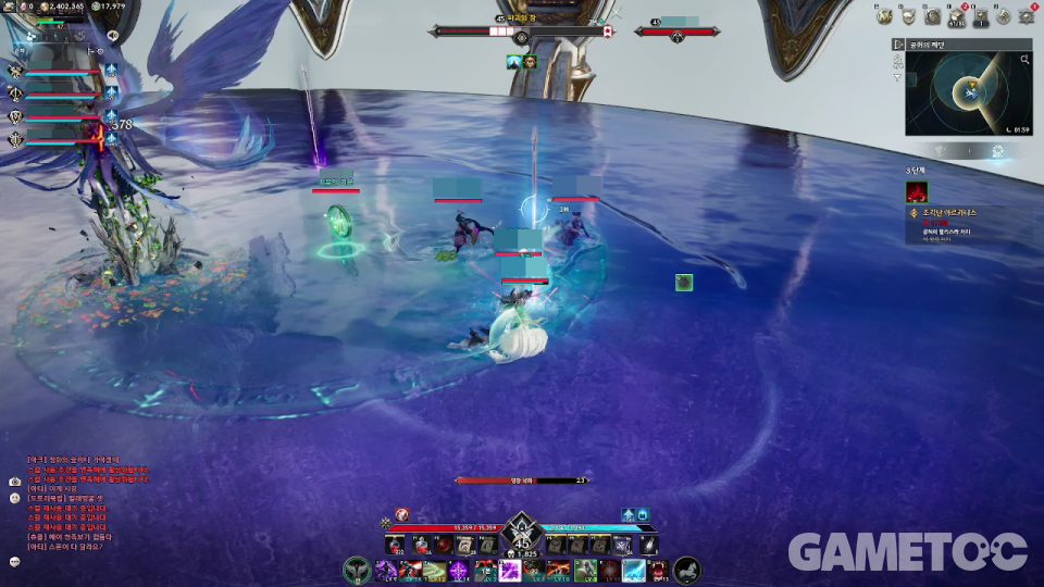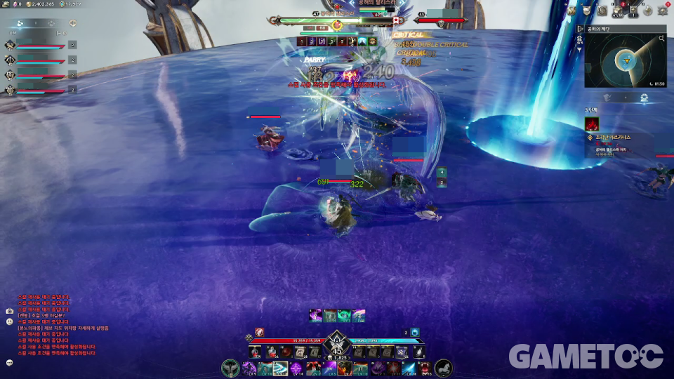 - 외곽에서 보스에게 이동하는 파란색·보라색 구체 획득(각 색상별 2명씩 담당)