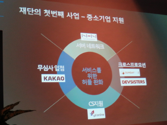 남궁훈 이사장은 “만약 '힘내라 게임인상'에 선정된 개발사의 경우 우선 카카오에 무심사로 입점 가능하다. 그리고 NHN 엔터테인먼트에서 서버와 네트워크를 무상으로 지원해주기로 했다. 선데이토즈와 데브시스터즈는 각각 10억여 원씩 게임 아이템을 마련해주기로 했다"며 "물론 크로스 프로모션을 게임인재단이 진행하는 것은 아니다. 하지만 아이템을 제공하면서 기본적 툴을 마련하는 것이다. 그리고 YD온라인에서는 CS를 지원할 예정이다. 철저하게 서포트의 목적이다. 그리고 2차는 도움을 받은 회사의 차기작 대박이다”고 이야기했다.